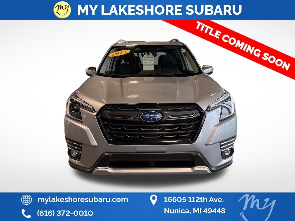 Forester Touring, Ice Silver Metallic, *ALL WHEEL DRIVE*, *APPLE CARPLAY & ANDROID AUTO*, *BLIND SPOT MONITORING*, *EYESIGHT Driver Assist*, *HEATED REAR Seats*, *HEATED STEERING WHEEL*, *LANE DEPARTURE WARNING*, *LEATHER HEATED POWER SEATS*, *LOCAL TRADE*, *OIL CHANGES for LIFE*, *PANORAMIC MOONROOF*. Certified. Ice Silver Metallic 2023 Subaru Forester Touring AWD Lineartronic CVT 2.5L 4-Cylinder DOHC 16V