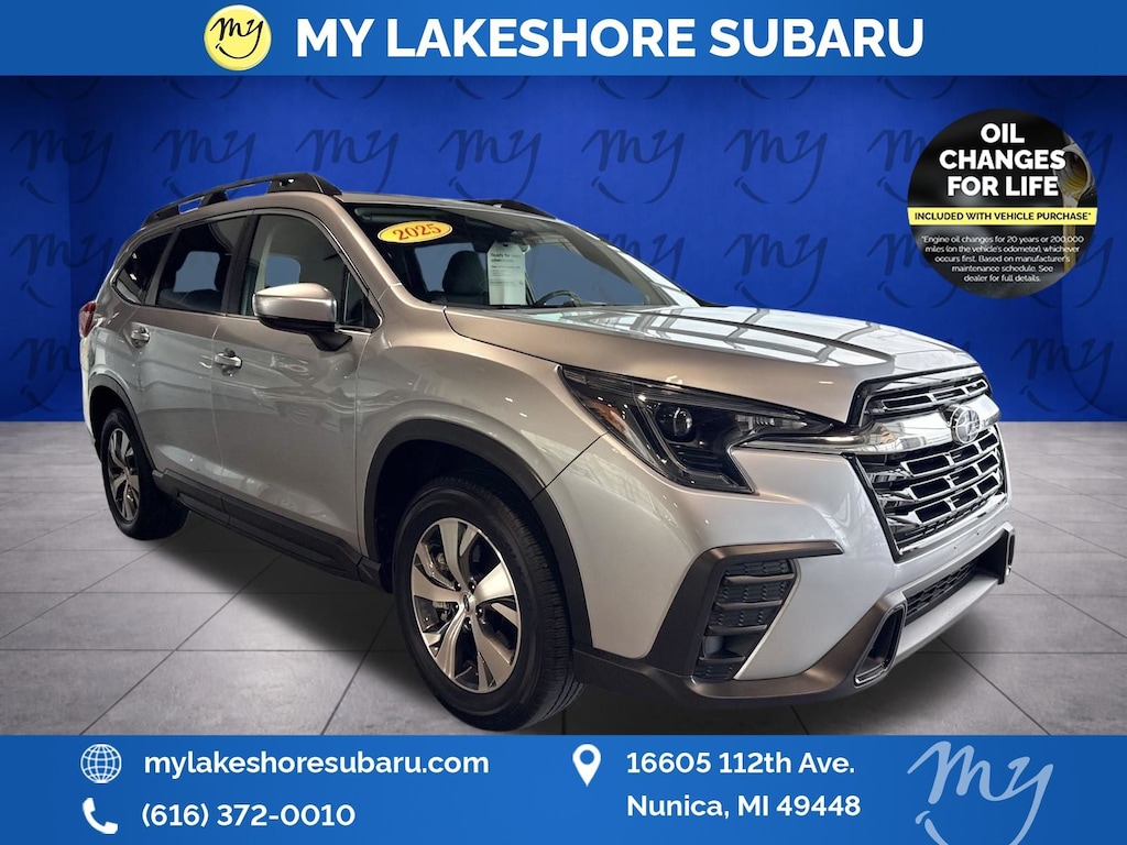 Ascent Premium, Ice Silver Metallic, *ALL WHEEL DRIVE*, *APPLE CARPLAY & ANDROID AUTO*, *BACKUP CAMERA*, *BLIND SPOT MONITORING*, *EYESIGHT Driver Assist*, *HEATED SEATS*, *LANE DEPARTURE WARNING*, *OIL CHANGES for LIFE*. Certified. Ice Silver Metallic 2025 Subaru Ascent Premium AWD Lineartronic CVT 2.4L 4-Cylinder DOHC 16V