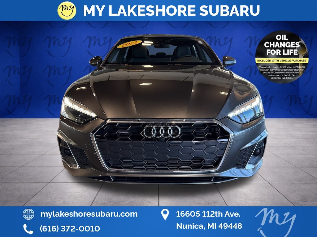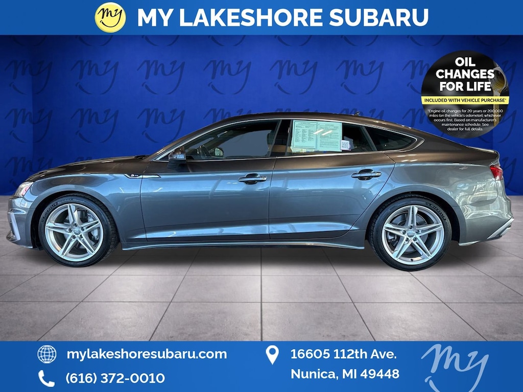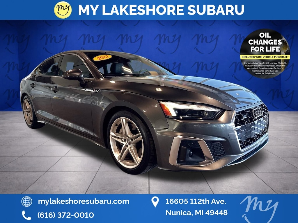 A5 Sportback 45 S line Premium Plus quattro, Manhattan Gray Metallic, *ALL WHEEL DRIVE*, *APPLE CARPLAY & ANDROID AUTO*, *BACKUP CAMERA*, *HEATED STEERING WHEEL*, *LEATHER HEATED POWER SEATS*, *LOCAL TRADE*, *MOONROOF*, *OIL CHANGES for LIFE*. Manhattan Gray Metallic 2021 Audi A5 Sportback 45 S line Premium Plus quattro quattro 7-Speed Automatic S tronic 2.0L 4-Cylinder TFSI