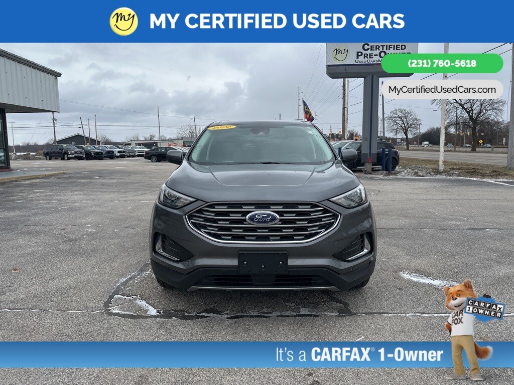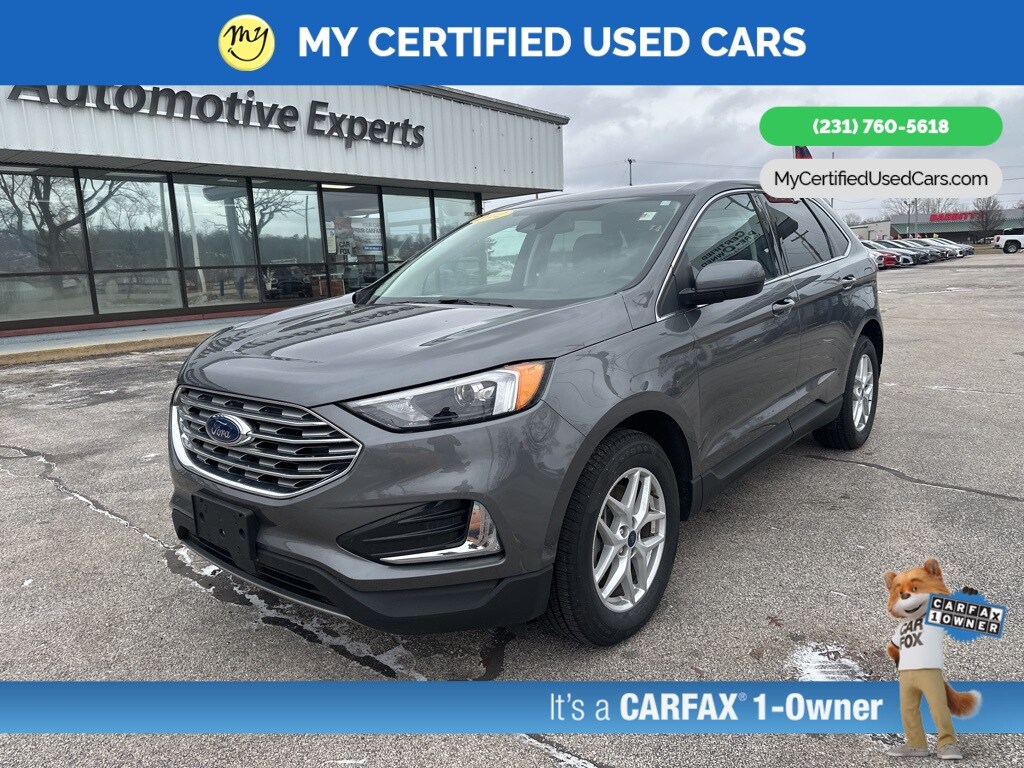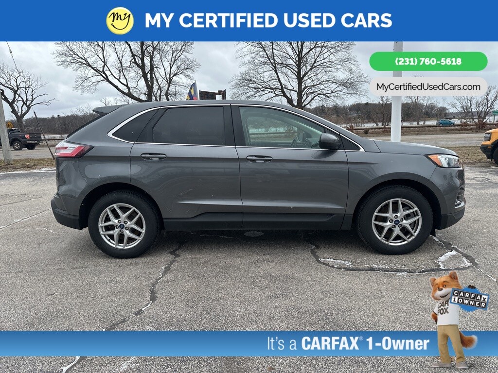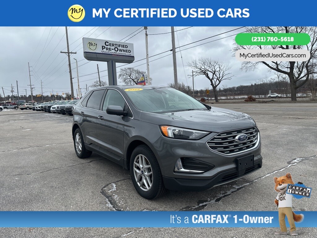 *VERY CLEAN* ***2022 FORD EDGE SEL AWD***, **NO ACCIDENTS**, **ONE OWNER**, *FULLY SERVICED* *REMOTE START* *LEATHER HEATED POWER SEATS* *NAVIGATION SYSTEM* *LANE DEPARTURE WARNING* *ADAPTIVE CRUISE*, *BLIND SPOT MONITORING SYSTEM*, *HANDSFREE BLUETOOTH*, *ADAPTIVE CRUISE*, *APPLE CARPLAY & ANDROID AUTO* , *REARVIEW CAMERA*, Connected Built-In Navigation, Equipment Group 201A, Evasive Steering Assist, Ford Co-Pilot360 Assist+, Lane Centering, Navigation System, Rear Parking Sensors. MY Certified Used Cars of Muskegon is your #1 choice in Michigan to get the BEST PRICE on used vehicles and BEST value for your trade. The MY Certified Used Cars team is ready to provide you with a world-class experience, ensuring that you find the perfect vehicle that fits all your needs. Every vehicle has been through a full safety inspection completed by certified technicians and fully detailed. We sell many makes and models, Pre-Owned Vehicles with years from 2025-2024-2023-2022-2021-2020-2019-2018-2017-2016-2015-2014-2013-2012-2011-2010-2009-2008-2007 and all makes Audi, BMW, Chevrolet, Toyota, Volkswagen, Kia, Hyundai, Mercedes, Dodge, Chrysler, Jeep, Ram, Lincoln, Honda, Subaru, and many models like Bronco, Bronco Sport, Edge, Escapes, Expedition, Explorer, Fusions, Focus, Flex, F-150 Series, F-250, F-350, Super Duty Diesel Trucks, Maverick, Mustang MACH-E, Mustang, Ranger, Transit, Wrangler, Grand Cherokee, Grand Cherokee L, Wagoneer, Gladiator, Grand Caravan, RAM, RAM HEMI, and more. Take advantage of our VIP experience by calling 231-760-5618 to schedule a test drive. Read our customer reviews at www.mycertifiedusedcars.com/testimonials or view our entire selection of preowned vehicles at www.mycertifiedusedcars.com, or stop by today, located at 3692 Airline Rd. Muskegon, MI 49444. CARFAX One-Owner. Gray Metallic 2022 Ford Edge SEL AWD 8-Speed Automatic EcoBoost 2.0L I4 GTDi DOHC Turbocharged VCT Clean CARFAX.