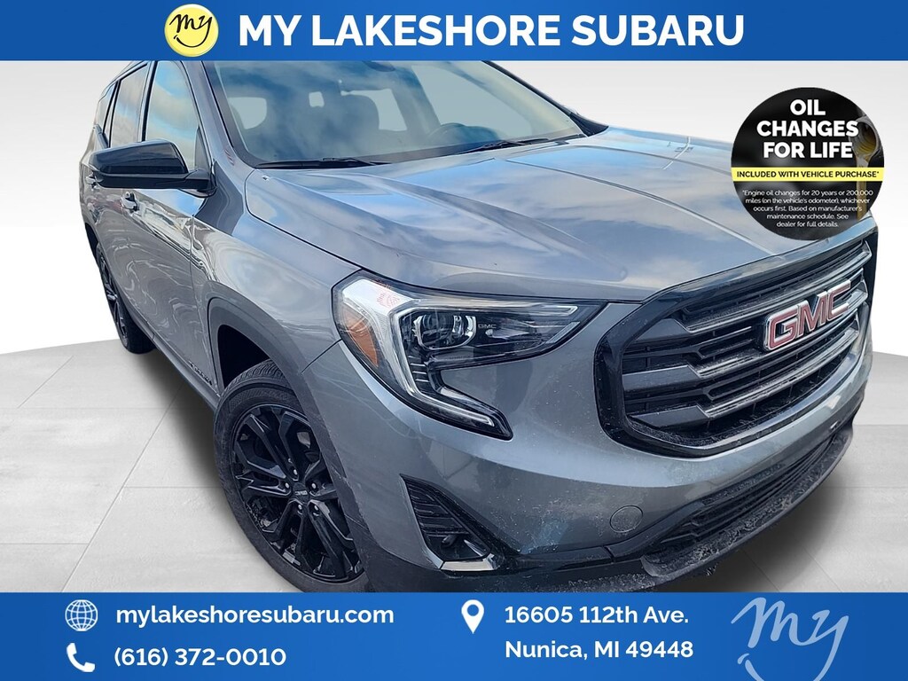 Terrain SLT, AWD, Satin Steel Metallic, *ALL WHEEL DRIVE*, *APPLE CARPLAY & ANDROID AUTO*, *HEATED STEERING WHEEL*, *LANE DEPARTURE WARNING*, *LEATHER HEATED POWER SEATS*, *LOCAL TRADE*, *OIL CHANGES for LIFE*, Black GMC Center Caps w/Black GMC Lettering, Black Mirror Caps, Darkened Front Grille, Elevation Edition, Preferred Equipment Group 4SA, Roof-Mounted Luggage Rack Black Side Rails, Wheels: 19" x 7.5" Gloss Black Painted Aluminum. Satin Steel Metallic 2021 GMC Terrain SLT AWD 9-Speed Automatic 1.5L DOHC