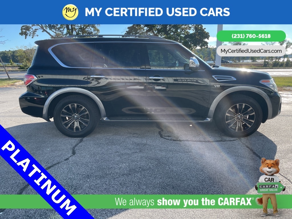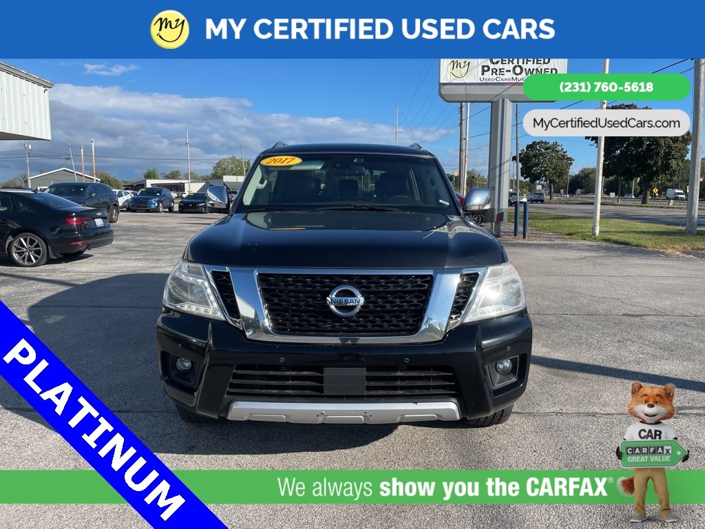 * Although every reasonable effort has been made to ensure the accuracy of the information contained on this site, absolute accuracy cannot be guaranteed. This site, and all information and materials appearing on it, are presented to the user "as is" without warranty of any kind, either express or implied, including but not limited to the implied warranties of merchantability, fitness for a particular purpose, title or non-infringement. All vehicles are subject to prior sale. Price does not include applicable tax, title, and license. Not responsible for typographical errors. **The arrival timeline is an estimate. It may vary due to circumstances beyond Subaru’s or the retailer’s control. Disclaimer: "There will be a surcharge applied to all credit card transactions that does not exceed our cost of acceptance4WD, *BACKUP SENSORS*, *BLIND SPOT MONITORING SYSTEM*, *CRUISE CONTROL*, *LEATHER HEATED POWER SEATS*, *LOCAL TRADE*, *MOONROOF*, *PREMIUM WHEELS*, *REARVIEW CAMERA*, *REMOTE START*, *SUPER BUY*, *THIRD ROW SEATING*, *VERY CLEAN*, Heated door mirrors, Heated rear seats, Navigation System, Power Liftgate, Power moonroof. MY Certified Used Cars of Muskegon is your #1 choice in Michigan to get the BEST PRICE on used vehicles and BEST value for your trade. The MY Certified Used Cars team is ready to provide you with a world-class experience, ensuring that you find the perfect vehicle that fits all your needs. Every vehicle has been through a full safety inspection completed by certified technicians and fully detailed. We sell many makes and models, Pre-Owned Vehicles with years from 2025-2024-2023-2022-2021-2020-2019-2018-2017-2016-2015-2014-2013-2012-2011-2010-2009-2008-2007 and all makes Audi, BMW, Chevrolet, Toyota, Volkswagen, Kia, Hyundai, Mercedes, Dodge, Chrysler, Jeep, Ram, Lincoln, Honda, Subaru, and many models like Bronco, Bronco Sport, Edge, Escapes, Expedition, Explorer, Fusions, Focus, Flex, F-150 Series, F-250, F-350, Super Duty Diesel Trucks, Maverick, Mustang MACH-E, Mustang, Ranger, Transit, Wrangler, Grand Cherokee, Grand Cherokee L, Wagoneer, Gladiator, Grand Caravan, RAM, RAM HEMI, and more. Take advantage of our VIP experience by calling 231-760-5618 to schedule a test drive. Read our customer reviews at www.mycertifiedusedcars.com/testimonials or view our entire selection of preowned vehicles at www.mycertifiedusedcars.com, or stop by today, located at 3692 Airline Rd. Muskegon, MI 49444. Super Black 2017 Nissan Armada Platinum 4WD 7-Speed Automatic 5.6L V8 DOHC 32V Endurance