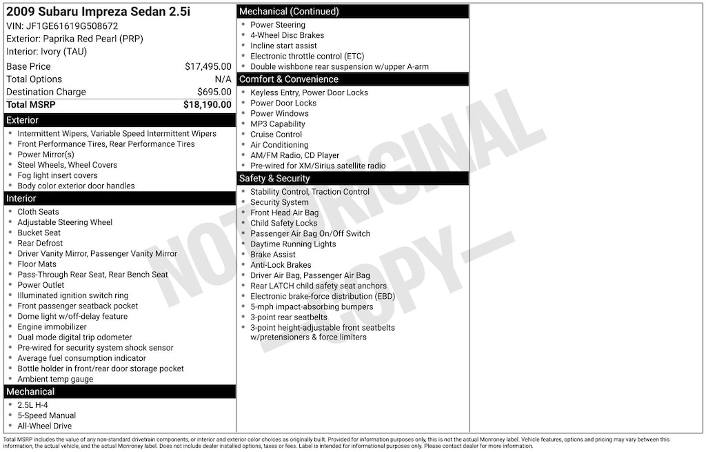 Prp 2009 Subaru Impreza 2.5i AWD 5-Speed Manual with Overdrive 2.5L SOHC