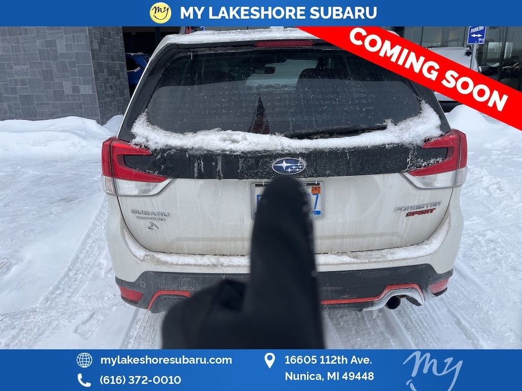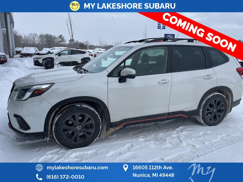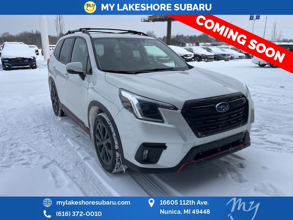 Forester Sport, Crystal White Pearl, *ALL WHEEL DRIVE*, *APPLE CARPLAY & ANDROID AUTO*, *BLIND SPOT MONITORING*, *EYESIGHT Driver Assist*, *HEATED SEATS*, *LANE DEPARTURE WARNING*, *LOCAL TRADE*, *OIL CHANGES for LIFE*, *PANORAMIC MOONROOF*, 8" Audio w/harman/kardon & RAB & Power Rear Gate, harman/kardon 9-Speaker Audio System, Power Rear Gate, Radio: Subaru Starlink 8.0" Multimedia Plus System, Reverse Automatic Braking System (RAB). Certified. Crystal White Pearl 2023 Subaru Forester Sport AWD Lineartronic CVT 2.5L 4-Cylinder DOHC 16V