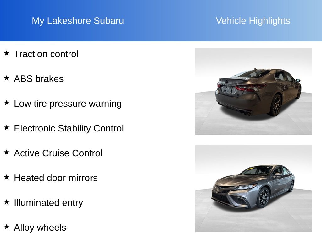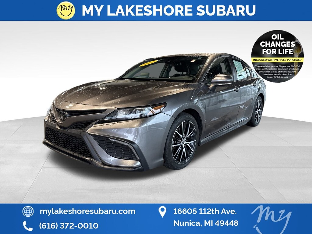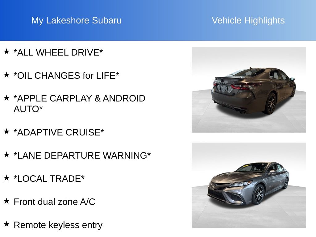 2.5L I4 DOHC 16V, AWD, *ADAPTIVE CRUISE*, *ALL WHEEL DRIVE*, *APPLE CARPLAY & ANDROID AUTO*, *LANE DEPARTURE WARNING*, *LOCAL TRADE*, *OIL CHANGES for LIFE*, ABS brakes, Active Cruise Control, Alloy wheels, Electronic Stability Control, Front dual zone A/C, Heated door mirrors, Illuminated entry, Low tire pressure warning, Remote keyless entry, Traction control. Predawn Gray Mica 2022 Toyota Camry SE AWD 8-Speed Automatic 2.5L I4 DOHC 16V